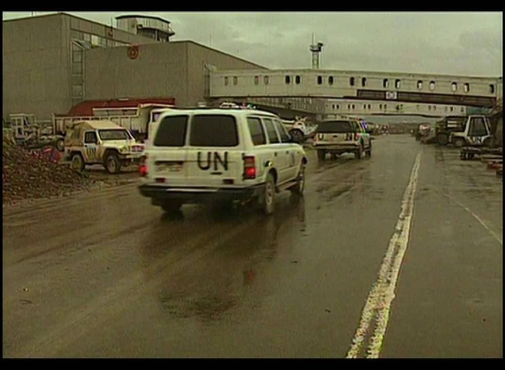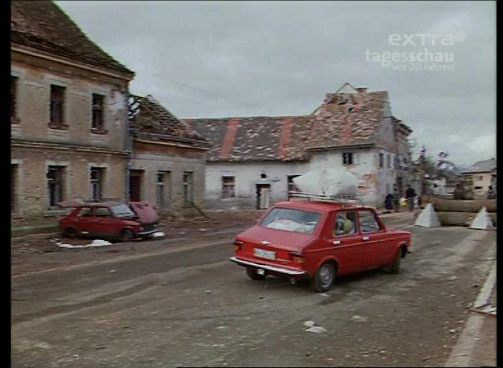 Seven monitors transmit excerpts from television reports on the Yugoslav wars, the ten-day war in Slovenia in June 1991, and the Srebrenica massacre in July 1995. For his work, Polster recorded relevant repeats of the German news program Die Tagesschau twenty years later, as transmitted by digital station tagesschau24 (still named ARD EinsExtra until 2012). He selected the reports on Yugoslavia from roughly 200 hours of material to present them in a condensed montage on all seven monitors simultaneously.